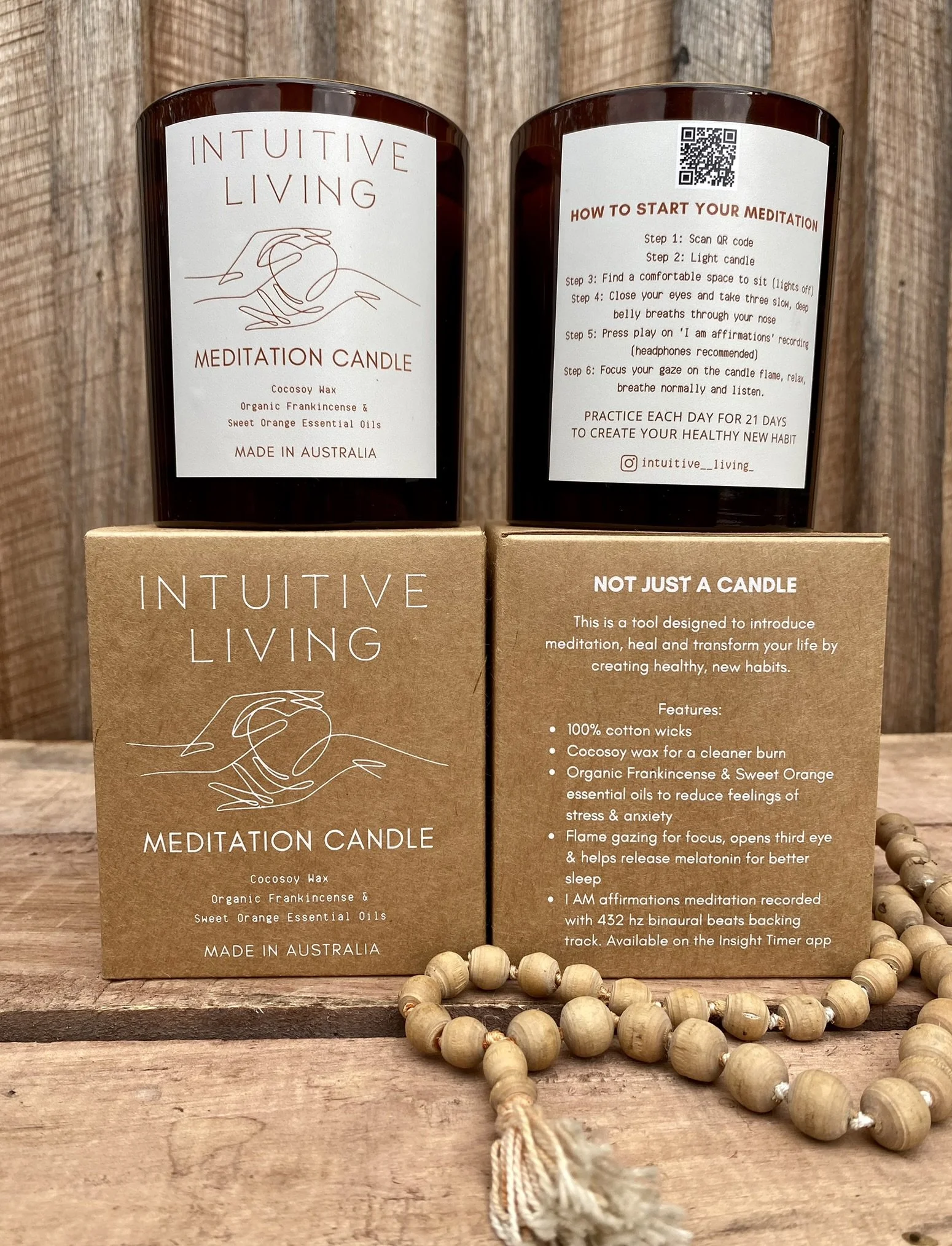 Each candle includes a guided “I AM” affirmations meditation recorded with 432hz binaural beats. Simply light the flame, scan the QR code and follow the ritual to settle your mind and soften your breath. The cotton wick is perfect for flame gazing, helping quiet mental chatter and encourage deeper rest.